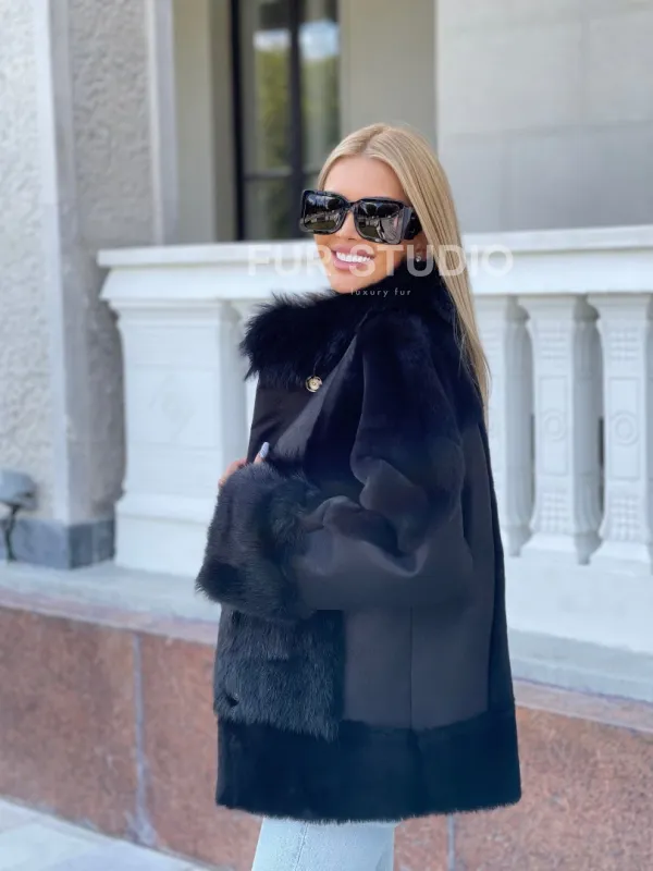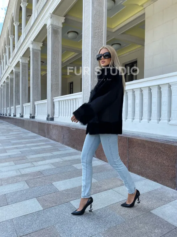 Черная дубленка из натуральной овчины. Модель предлагается в размерах от 42 до . Оптимальная длина моделей 60-65 см подчеркивает линии вашей фигуры. Эта дубленка станет неотъемлемой частью гардероба для тех, кто предпочитает роскошь и утонченность натуральной кожи.
