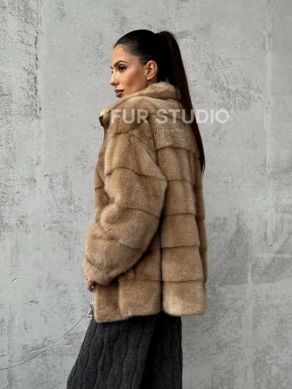 Мех данной шубы аукционная норка, цвет бежевый. Предлагается в размерах от 42 до 50. Длина модели 65-70 см, что выгодно подчеркивает фигуру девушек. Эта модель идеально подойдет для девушек и женщин, предпочитающих роскошные натуральные меха.