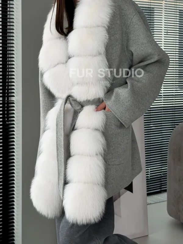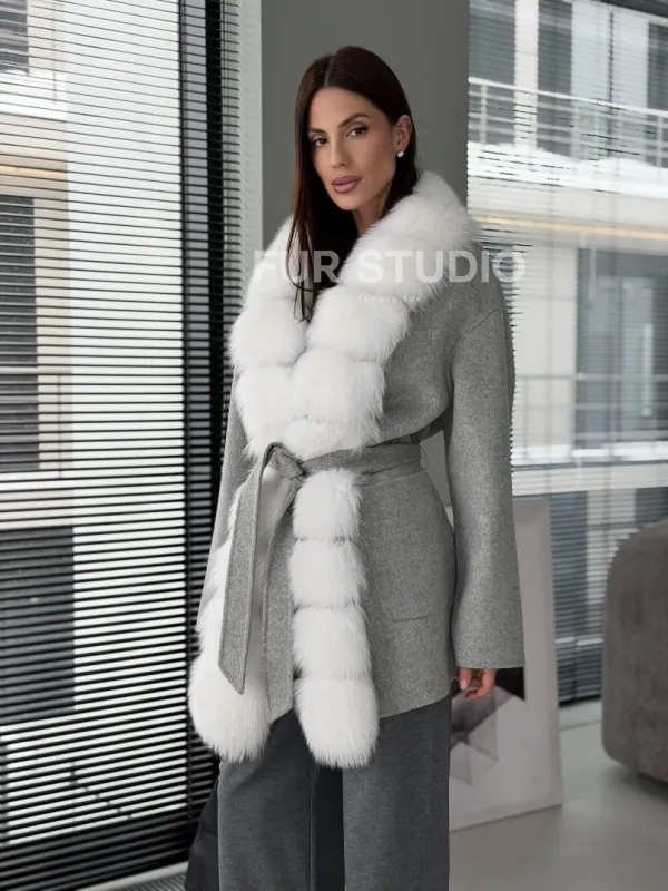Серое пальто с меховым воротником 102909