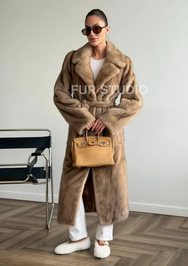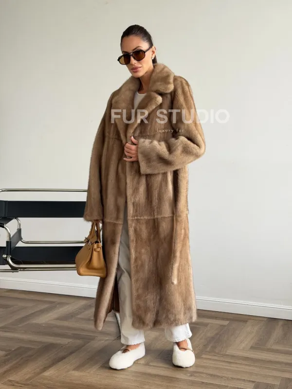 Мех данной шубы аукционная норка , цвет бежевый. Предлагается в размерах от 42 до 50. Длина модели 115-120 см, что выгодно подчеркивает фигуру девушек. Эта модель идеально подойдет для девушек и женщин, предпочитающих роскошные натуральные меха.