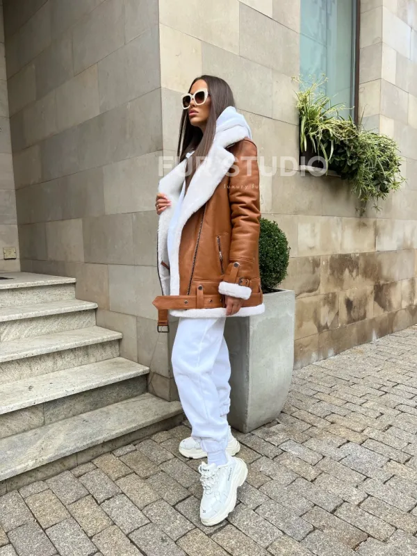 Женская дубленка авиатор в цвете виски – выбор современных девушек. Модель авиатор хит этого года. В дубленке будете выглядеть стильно и ярко вне зависимости от времени года. Яркая расцветка отлично гармонирует с любым цветом волос. Теплая подкладка позаботится о том, чтобы владелица не замерзла в сильные холода. Шикарный воротник подчеркнет изгибы шеи и согреет ее от непогоды.